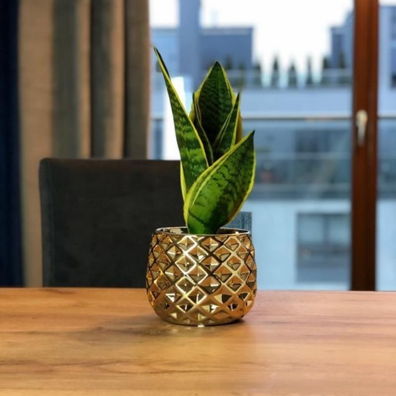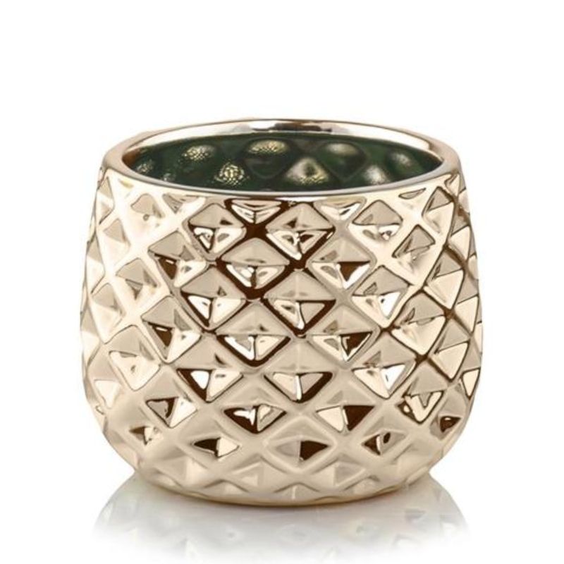Okrasni keramični lonec zlate barve s sijajem iz kolekcije Moon. Okrogel lonec z geometrijskim reliefom, nežno zožen proti vrhu, ki spominja na ananas. Izdelek je narejen iz visokokakovostne glazirane keramike.
