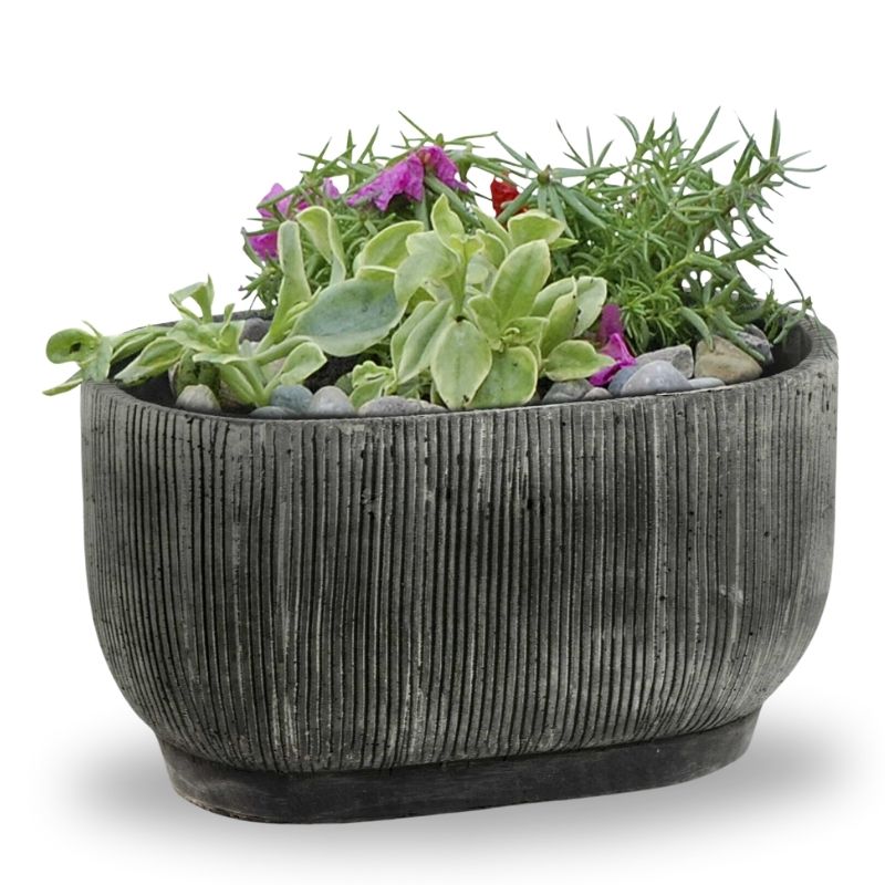 Keramični okrasni lonec iz kolekcije Home Gardens podolgovate oblike v sivi barvi z vertikalnim vrezljanim vzorcem v beli barvi.