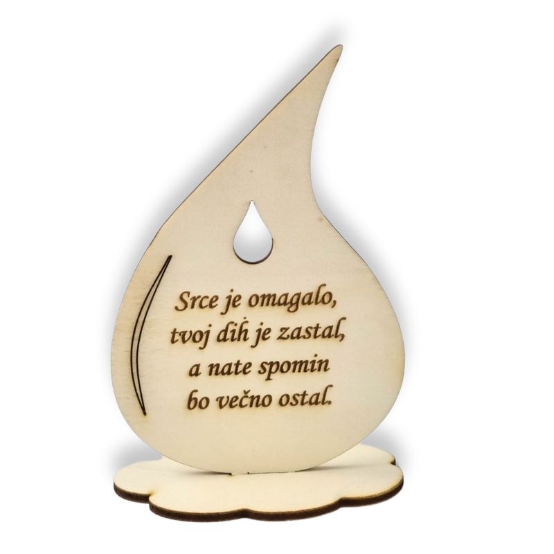 Lesena solzica z graviranim napisom na oblačku.