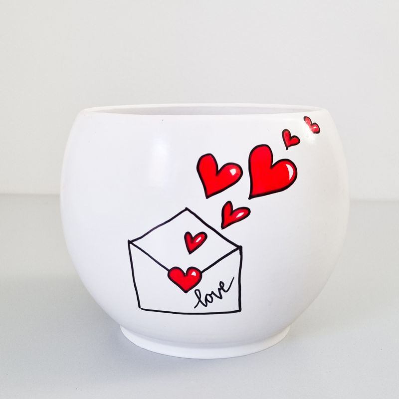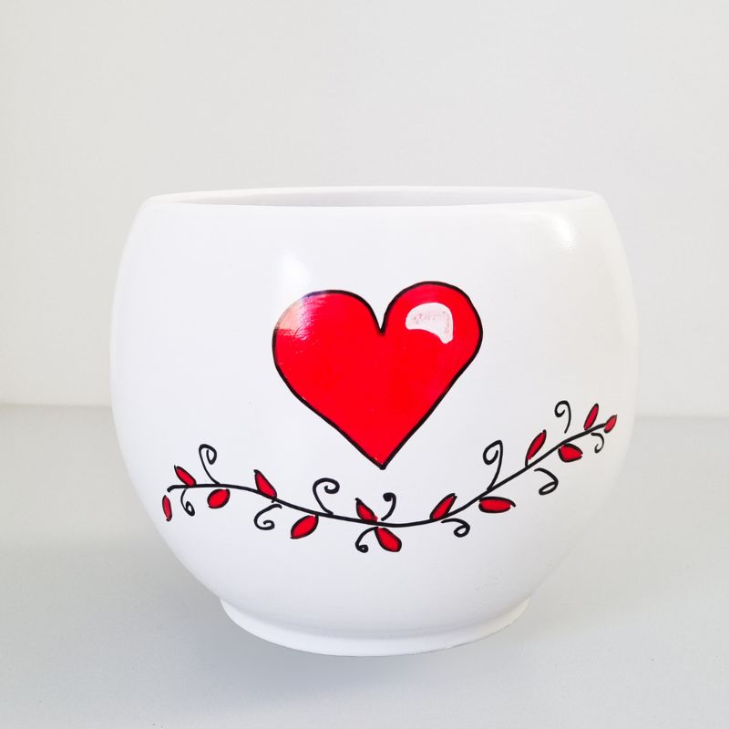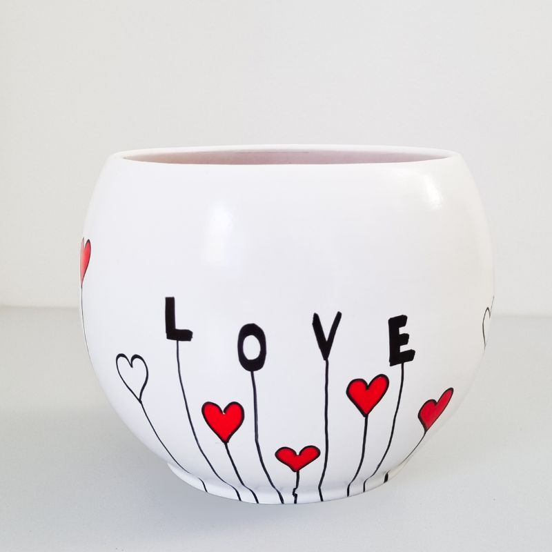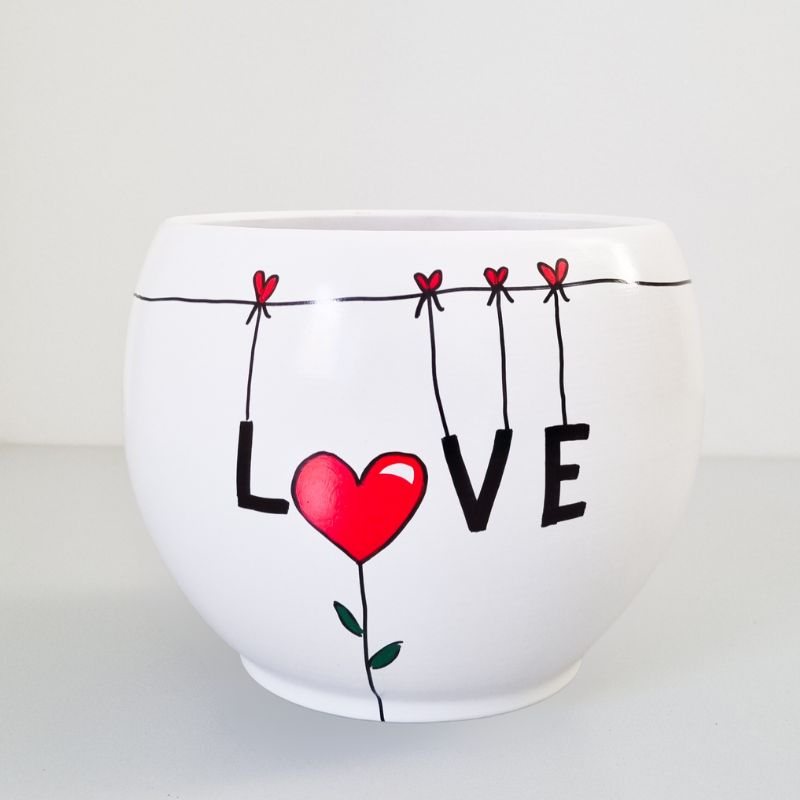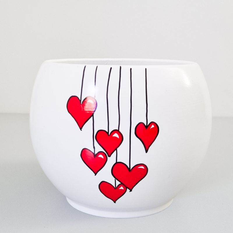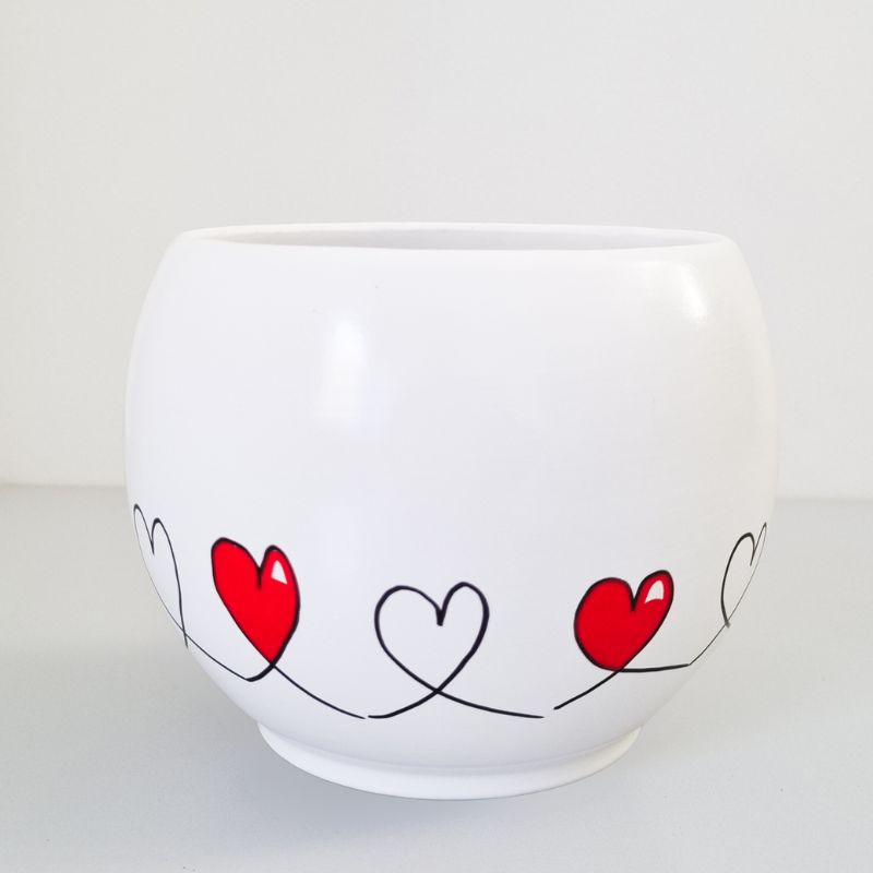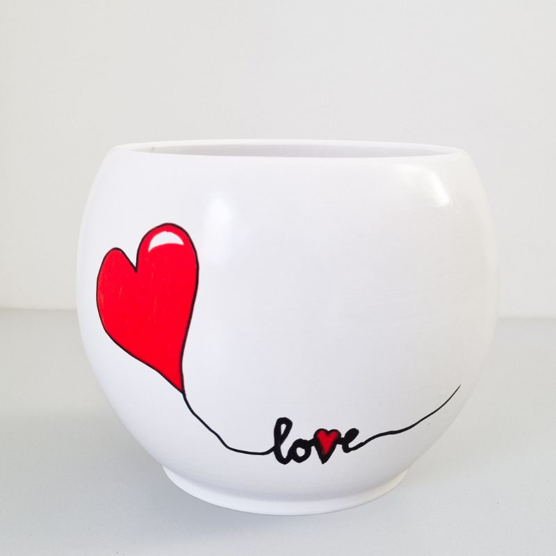 Ročno poslikan lonec Bali okrogel premera 15 cm za manjše lončnice. Navdih za dizajne sta valentinovo in ljubezen.