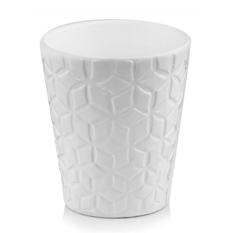 Okrasni keramični lonec, primeren za orhideje in druge lončnice iz kolekcije Orhideja v beli barvi s svetlečo glazuro in zanimivim vzorcem. Brezčasna, univerzalna in zelo funkcionalna oblika se bo podala k vsaki vrsti dekorja.