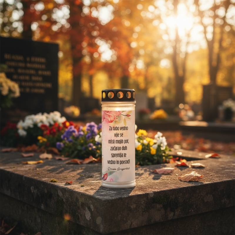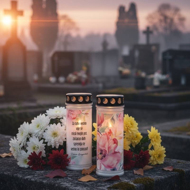 Sveča je na voljo v petih različnih motivih, vsak s skrbno izbranim napisom, ki izraža ljubezen, spoštovanje in večni spomin.