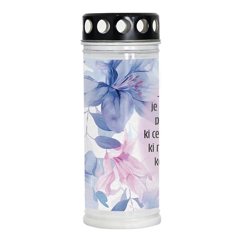 Nagrobna sveča premium kvalitete Premium Verz z rožnim motivom in verzom.