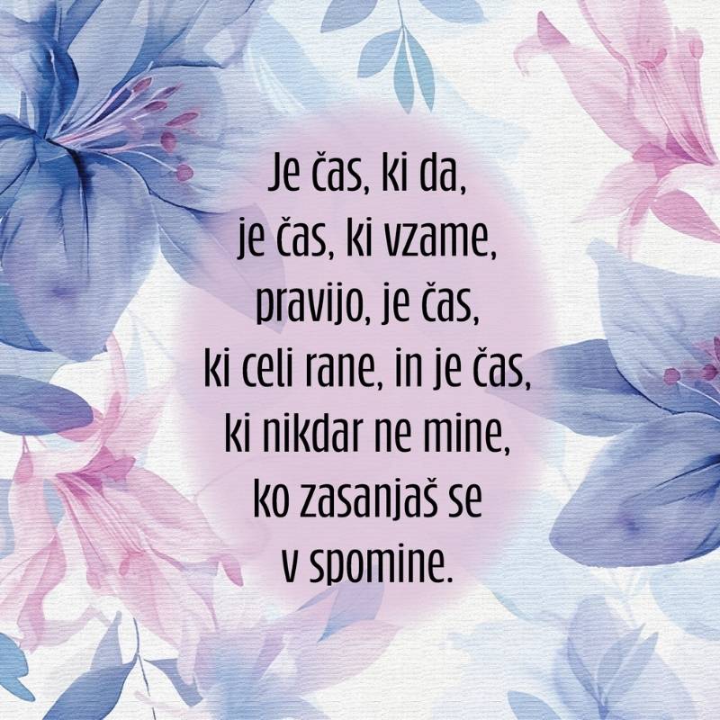 Verz: Je čas, ki da, je čas, ki vzame. Pravijo, je čas, ki celi rane. In je čas, ki nikdar ne mine, ko zasanjaš se v spomine.