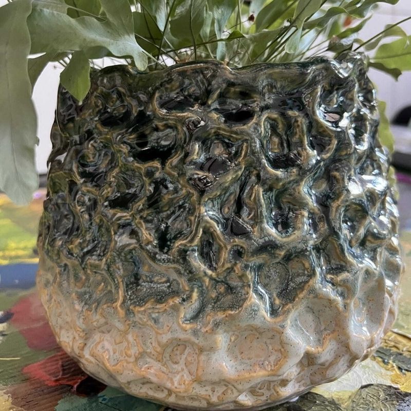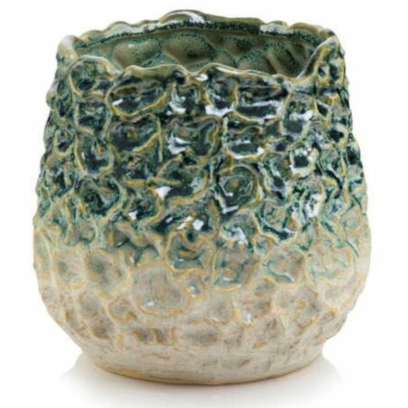 Keramični lonec iz kolekcije Home Gardensz notranjo in zunanjo glazuro ter edinstveno valovito teksturo, ki ji daje umetniški značaj. Barvna shema je umirjena bela krema s turkiznimi in modrimi odtenki, spominja na morsko deklico in tropsko plažo.